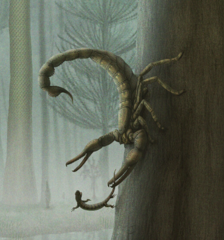 Pulmonoscorpius likely attained its substantial size due to the elevated oxygen levels during the Carboniferous era. While Pulmonoscorpius closely resembles modern scorpions in overall appearance, its relatively larger eyes suggest a potentially heightened reliance on visual hunting.